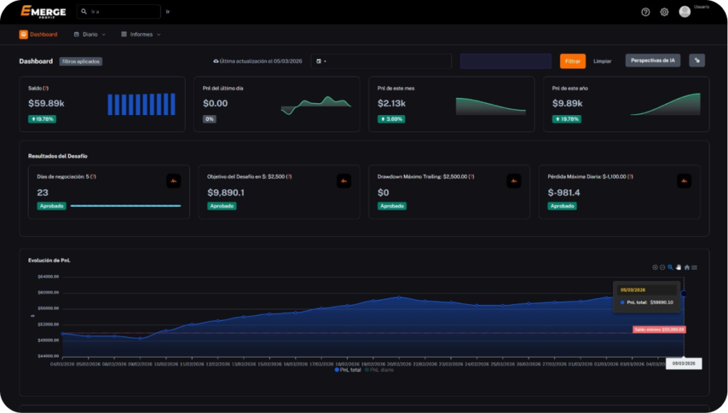 Ingresa el nombre de tu cuenta de Emerge Profit y accede al pulso de tu última semana operando en tu Desafío o Pase Directo.