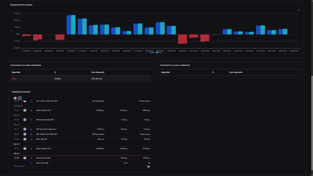 Consulta en tiempo real los eventos macroeconómicos que pueden impactar el mercado mientras analizas la evolución de tu PNL mediante gráficos claros. Anticipa la volatilidad y evalúa tu rendimiento.