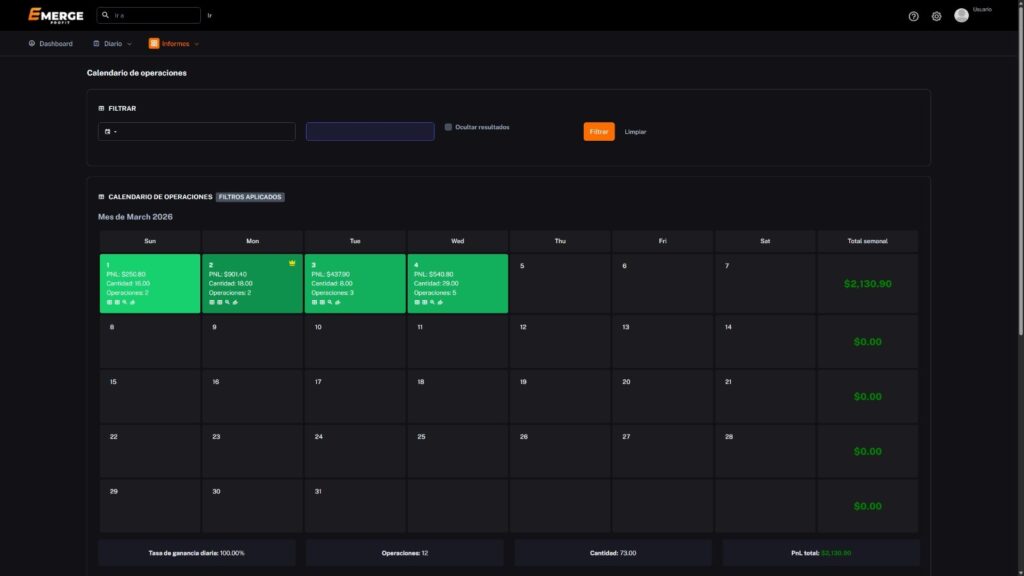 El Calendario de Operaciones de Emerge Profit te permite ver de forma clara cómo te fue cada día al tradear, con datos como tu PNL diario, la cantidad de operaciones realizadas y tu tasa de ganancia. Además, organiza automáticamente los resultados por semanas y te muestra el total acumulado, para que puedas detectar patrones, medir tu consistencia y entender mejor tu rendimiento con el paso del tiempo.