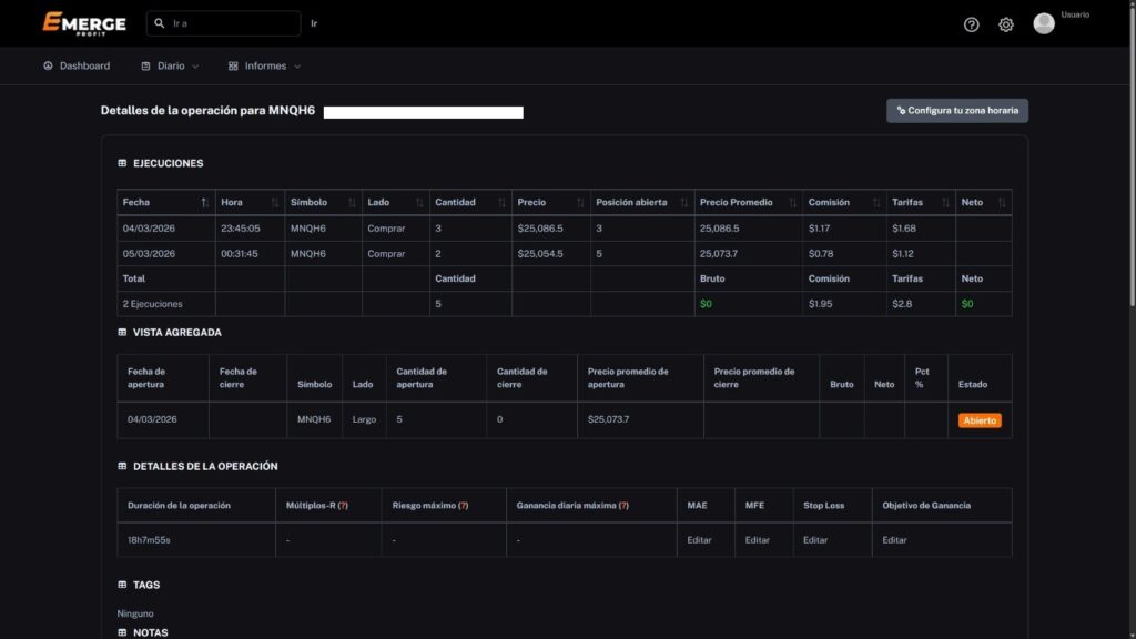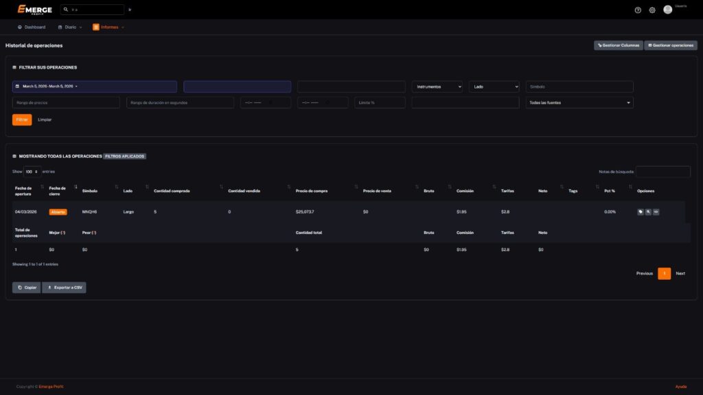 El Detalle de Operaciones te permite ver con precisión cómo se ejecutó cada trade, mostrando información clave como fecha y hora, símbolo operado, tipo de operación, contratos, precios de entrada y salida, comisiones y resultado. Además, reúne los datos más importantes en una vista clara para que puedas entender mejor cada movimiento, evaluar la calidad de tu ejecución y mejorar tu estrategia con un seguimiento más completo de cada operación.